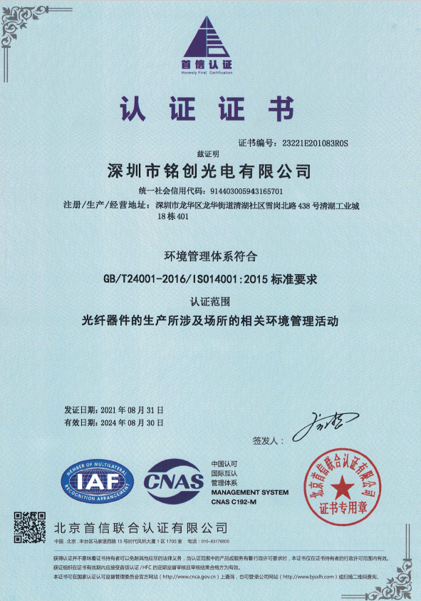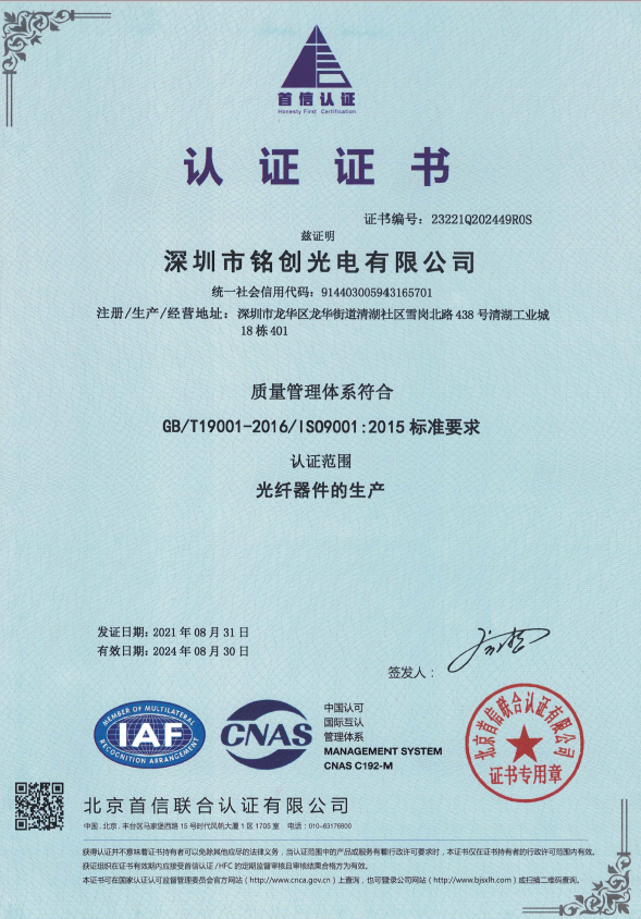 深圳市銘創(chuàng)光電有限公司于2012年成立,公司總部位于深圳市光明區(qū),是一家國家級高新技術企業(yè),通過了IS09001-2015質量管理體系認證和IS014001-2015環(huán)境管理體系認證;經過多年的持續(xù)研發(fā)投入和專注發(fā)展,銘創(chuàng)光電已逐漸成為光纖激光器、光纖傳感、激光雷達和激光通信等領域的綜合性產品服務商。 公司目前設立有光無源器件研發(fā)生產中心和激光研發(fā)生產中心。無源器件研發(fā)生產中心設有有高標準的無塵車間,可提供各種波長的無源光纖器件、高功率光纖器件、保偏光纖產品、超小型光纖器件。激光研發(fā)中心建立在安徽合肥市,研發(fā)生產特殊波長的激光光源、光纖激光器、光纖放大器以及新產品的技術研究儲備。研發(fā)生產中心與多地科研單位合作,能夠迅捷高效的為客戶提供相